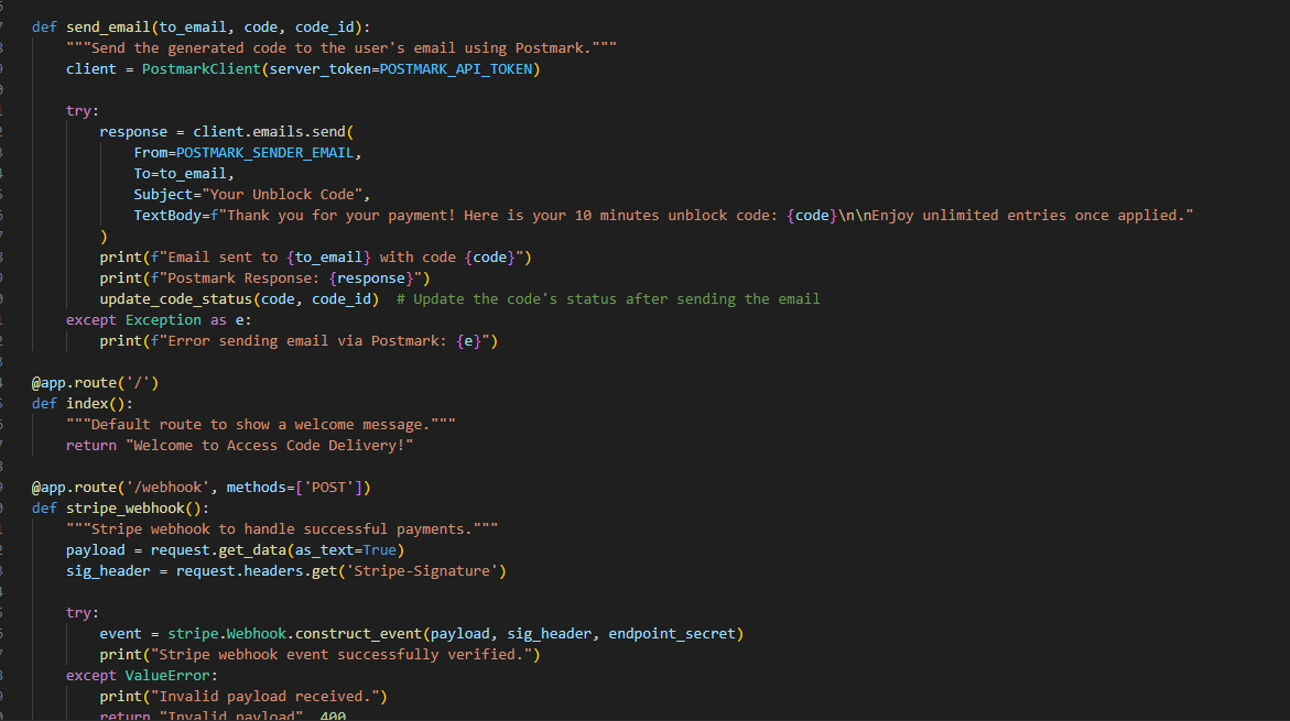 This code works with stripe Webhooks, and if a payment is made sends some acces code to paying client.